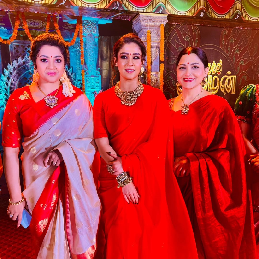 The much-anticipated “Mookuthi Amman 2” directed by the Talented Sundar C, Movie Pooja Ceremony was a grand affair, not just for its cinematic significance but also for the dazzling display of traditional fashion. Leading ladies of the industry, including Actress Nayanthara, Regina Cassandra, Meena, Kushbu, and Anchor Divya Dharshini, graced the occasion in exquisite sarees, celebrating Indian heritage with a regal touch.