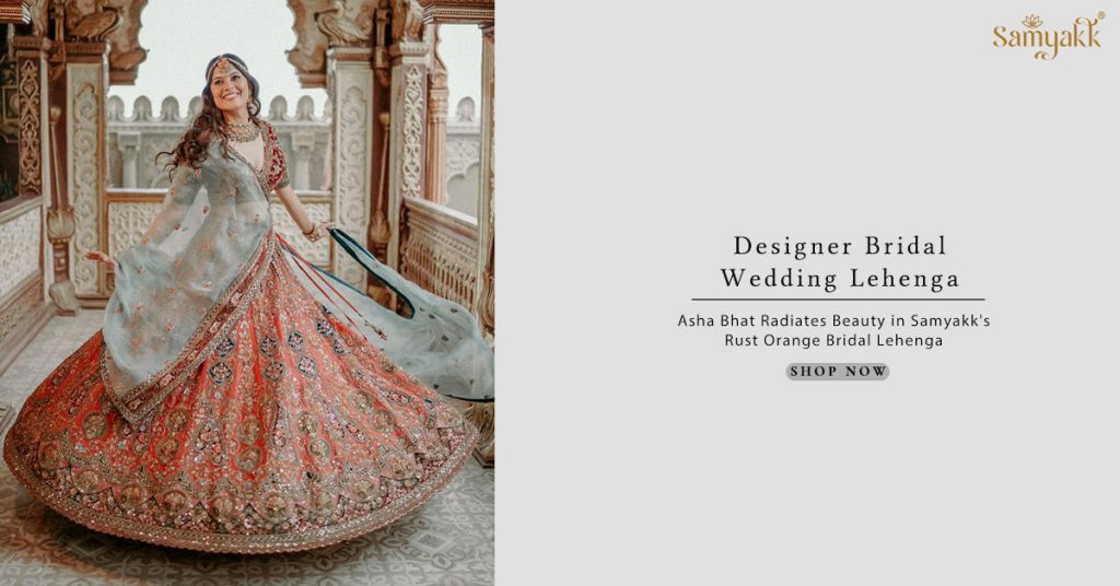 The Rust Orange Sequins Embroidered Raw Silk Bridal Lehenga from Samyakk.com stands as a testament to enduring elegance and craftsmanship. Beyond its aesthetic appeal, it symbolizes the fusion of tradition and modernity, honoring Indian heritage while embracing contemporary design. As Asha Bhat shines in this ensemble, she inspires admiration for cultural richness and innovation in fashion. Together, they epitomize timeless sophistication, leaving an indelible mark on the fashion world. This legacy of beauty and cultural celebration will resonate for generations to come. Samyakk.com offers all varieties of Bridal Lehenga, including Exclusive Bridal Lehenga, Red Bridal Lehenga, and Gold Bridal Lehenga in luxurious fabrics and exclusive designs, ensuring that every bride finds her perfect Bridal Lehenga Set at their store.