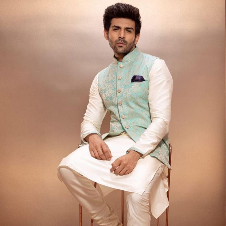 The intricate Nehru jacket kurta set of actor Kartik Aryan gives an aura of elegance, sophistication, and uniqueness. Whether it is semi-casual or casual gatherings, this kurta set with a waistcoat can rock your event. The contrast pastel Nehru jacket provides a structured yet relaxed silhouette. The kurta set is traditional, and it makes you look stylish and classic without taking away your comfort. The color combination makes a striking statement. Go for your unique color combinations for ethnic Nehru jacket sets.