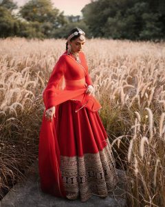 South Indian actress donned a custom-made red lehenga, which was beyond the fairytale. She chose the regal lehenga for her mehendi ceremony, which was a signature ‘Ek Taar’ lehenga by Monica Shah. The vermilion lehenga from the JADE collection offered magical moments to the couple, Nayanthara, and Vignesh Shivan. The lehenga featured intricate golden embroidery work with a hand-embellished dupatta. The vibrant hue of the lehenga reflected the actress’s love for tradition and heritage. Her choice of a fusion lehenga inspired fans for authenticity and grace. The royal red lehenga stood like a story for India’s culture, past, tradition, and craftsmanship. Her red wedding lehenga is a major goal for all fashionistas out there. Grab one if you too want to slay with your sartorial and heritage pics like the actress.