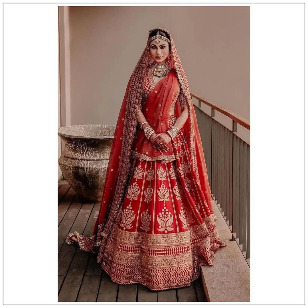 Mouni Roy’s lehenga was from Sabyasachi’s Heritage collection. The handmade golden borders, age-old paisley motifs, floral embroidery, and traditional red hue turned actress Mouni Roy into a coy bride. Her red veil garnered a lot of attention and was narrating a unique story. The veil had an inscription of ‘Ayushmati Bhavah’ and was looking blissful. The lehenga style also broke the monotony with its double dupatta style. Mouni Roy showcased the power and feminism of red on her wedding to Suraj Nambiar. The emerald necklace, gold choker, and maangtikka added to bridal fantasies. The red and gold Sabyasachi lehenga oozed finesse and royalty. This lehenga is fail-proof and a masterpiece for women looking for a combination of Indian culture, modernity, romance, extravagance, and class. Well, with the actress’s red lehenga, we can say that red fever is still up and running like never before. Grab one and appear dreamy and confident on your D-Day.