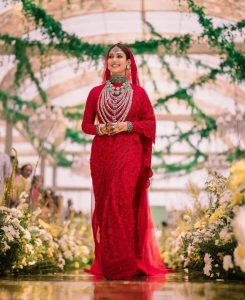 The actress’s lehenga was as lavish as her wedding ceremony with Sohael Khaturia. Her lehenga featured 18th-century brocade fragments and peacock motifs. She radiated royal vibes in a refreshing and traditional lehenga. The gorgeous red lehenga was designed with exquisite floral motifs as well as Mughal miniatures. Naqshi, sequins, and pearls also accentuated the classy wedding lehenga. Her customized Kaleeras took her wedding appearance up a notch, which also featured peacock trinkets. Her lehenga was also designed with peacock motifs, which hold deep meaning. Well, we think that this Indian celebrity thinks out of the box and adds an individual touch to make her dream come true. Her jewelry added edge to the whole Indian bridal look and feel.