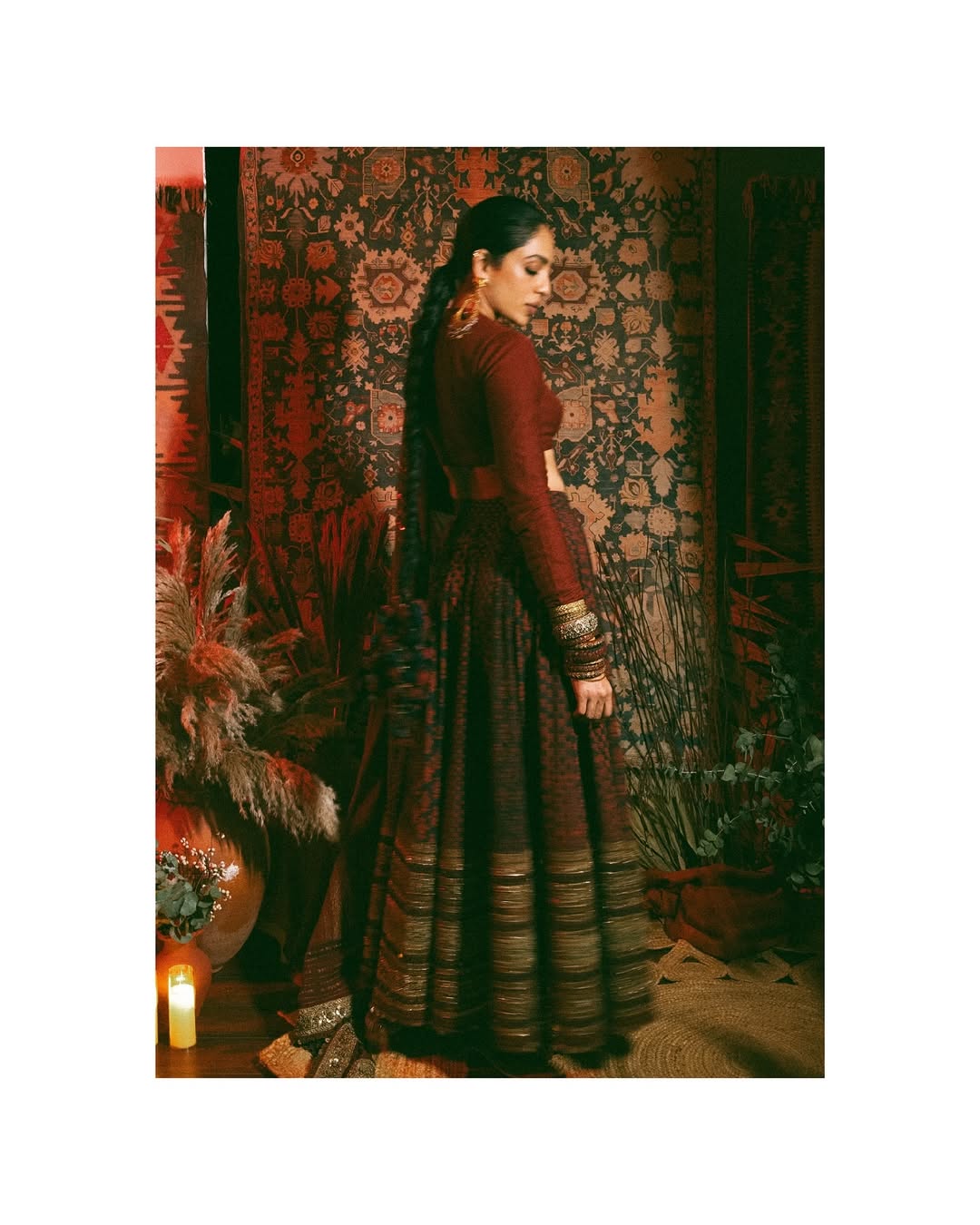 Indian actress and beauty pageant title holder Sobhita Dhulipala recently tied the knot with Indian actor and entrepreneur Naga Chaitanya. She opted for traditional clothing throughout her wedding festivities. But she showcased a resplendent look in a multi-coloured and multi-panelled red heritage lehenga that was far from run-of-the-mill. The lehenga featured a mix of shades- burgundy, brown, and ochre. Her monochrome brown-toned makeup with the lehenga turned her into a unique bride. The Banjara-themed Sabyasachi lehenga featured a heavily embroidered skirt, a dupatta, and an ethnic full-sleeved red choli. Her gorgeous ‘chotu lehenga’ was accentuated with gold jewels. Her chaandbaalis were also from the house of Indian designer Sabyasachi. Her bracelets, oxidised silver anklets, and handcrafted bellies were from Sabyasachi’s accessory collection.