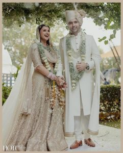 The actress tied the knot with Aam Aadmi Party politician Raghav Chadha in Udaipur, Rajasthan. She embraced a pastel-hued lehenga by designer Manish Malhotra. Her lehenga in a champagne tone was a sight to behold. The pearl detailing on the choli and dupatta added to the surreal avatar of the bride. The lehenga was amazingly ethnic and an epitome of dreams and fantasies. It was the moment to behold when she breezed in like a fairy with pastel perfection. She was looking pretty, stylish, and flirtatious in a dreamy pastel wedding lehenga. You can’t resist this lehenga for your once-in-a-lifetime moment.
