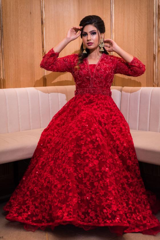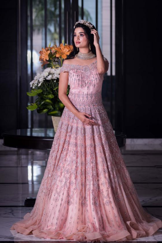 Prepare to turn heads in Samyakk’s designer gown design with oh-so-elegant artistry and luxe fabric for an opulent effect. Add elegant neckpiece, detailed bracelet, glittery pumps and boho french braid.