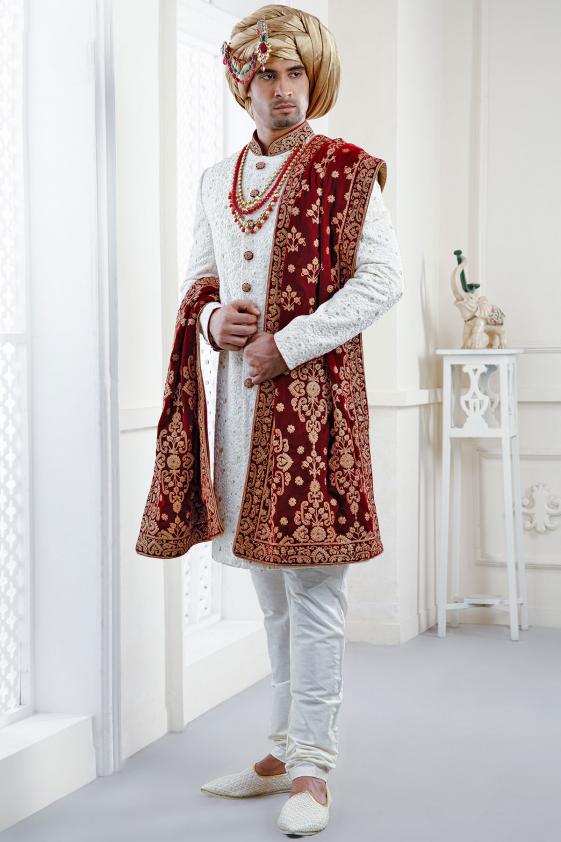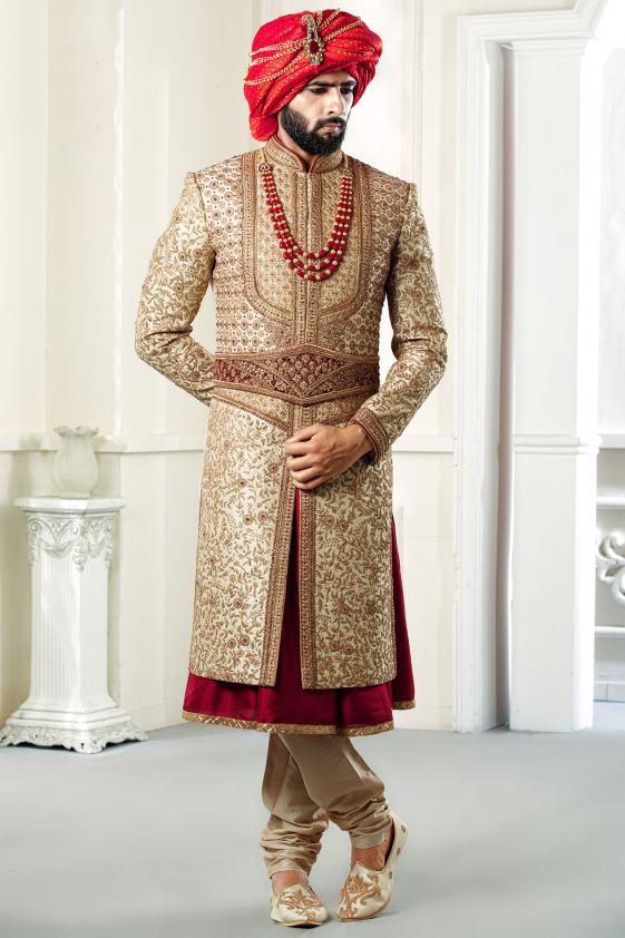 Make a fleek of royal impression by looking dapper in traditional wedding sherwani inspired by rich Indian heritage. Statement pearl haar, detailed mojari, matching safa and embroidered stole to add a little drama to your attire.