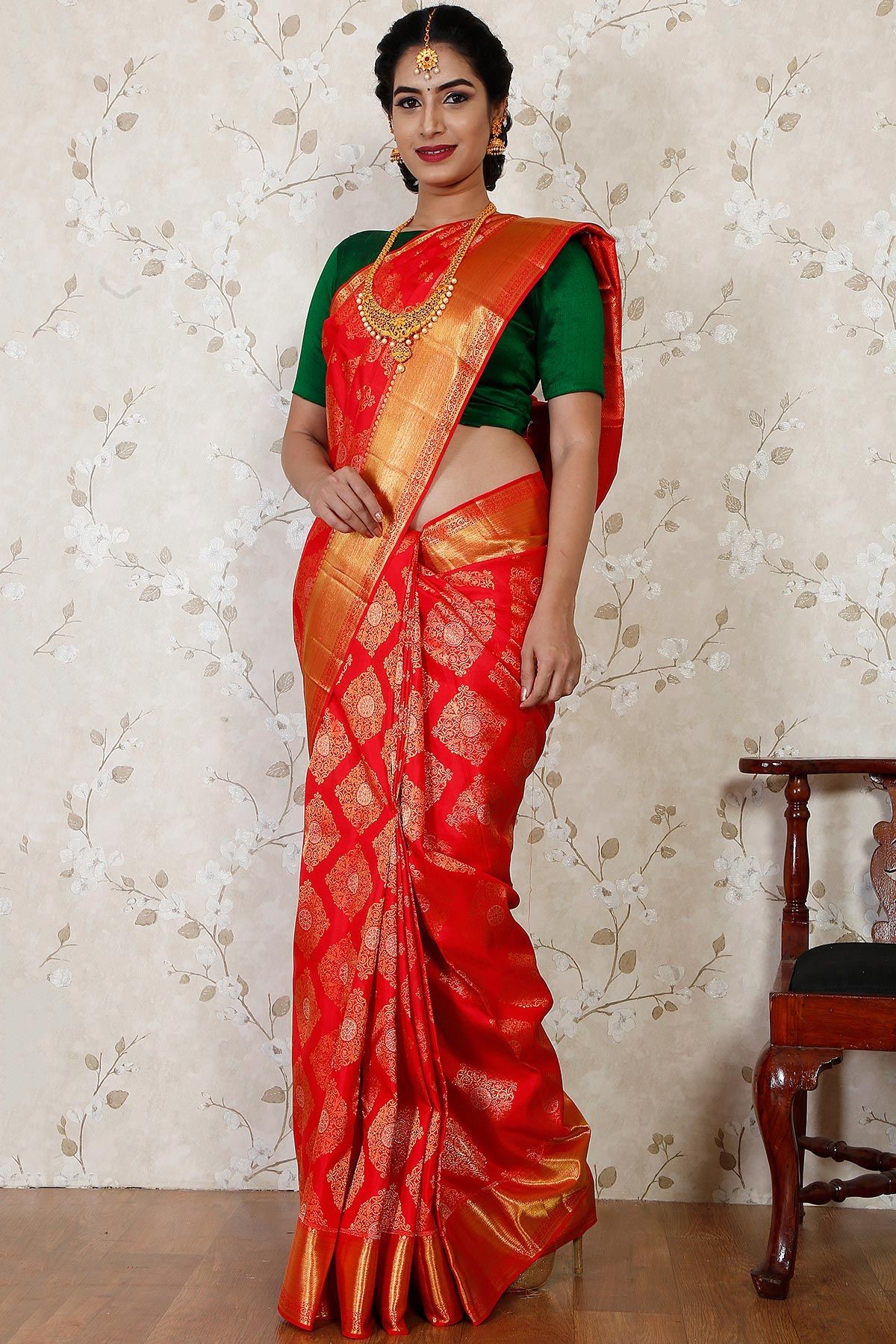 This silk sarees gets its name from a town called Kanchipuram in Tamil Nadu. They are known for the perfect blend of mulberry silk with pure gold zari designed with temple inspired scriptures all across the six yards.