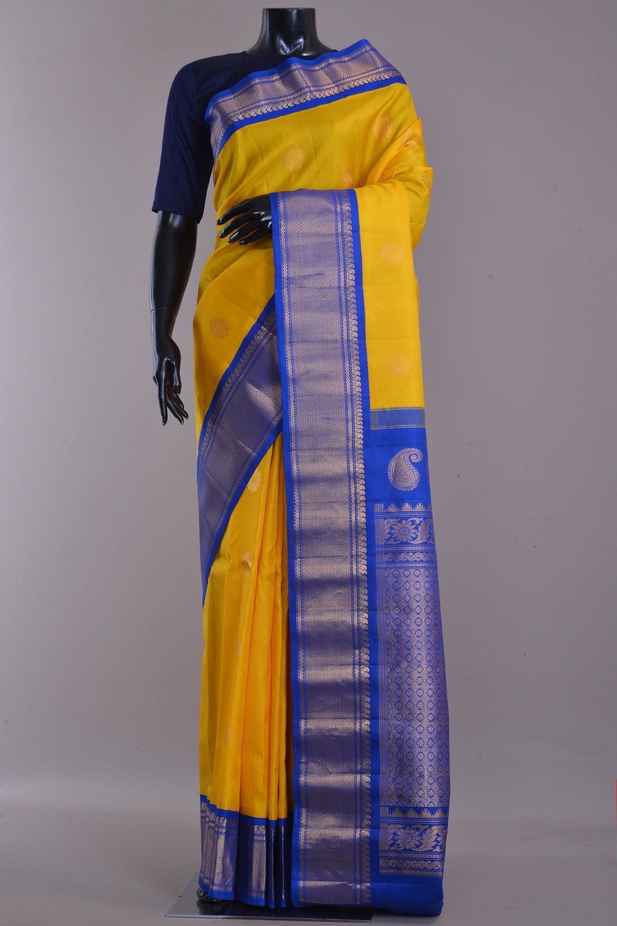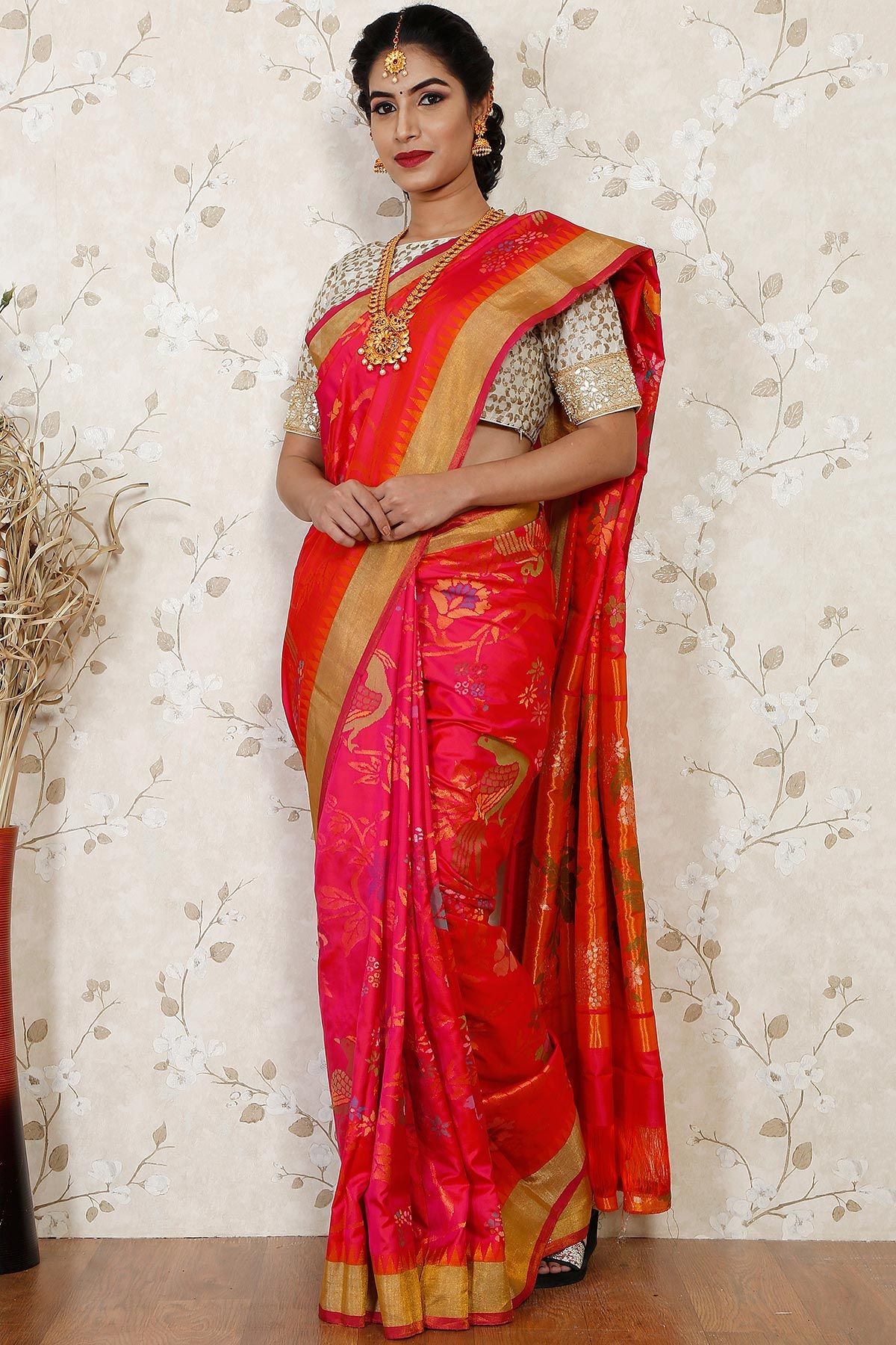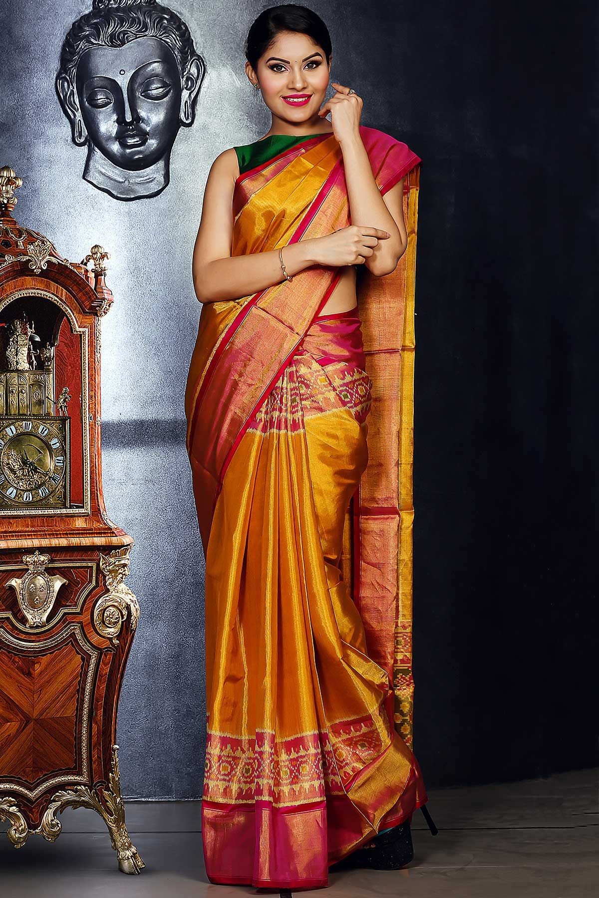 The drape is known for royalty and is finely woven with double ikkat resist dye fiber. The warp and weft yarn if first dyed based on the design and then woven together. The saree is also popularly known as unfading weaves.