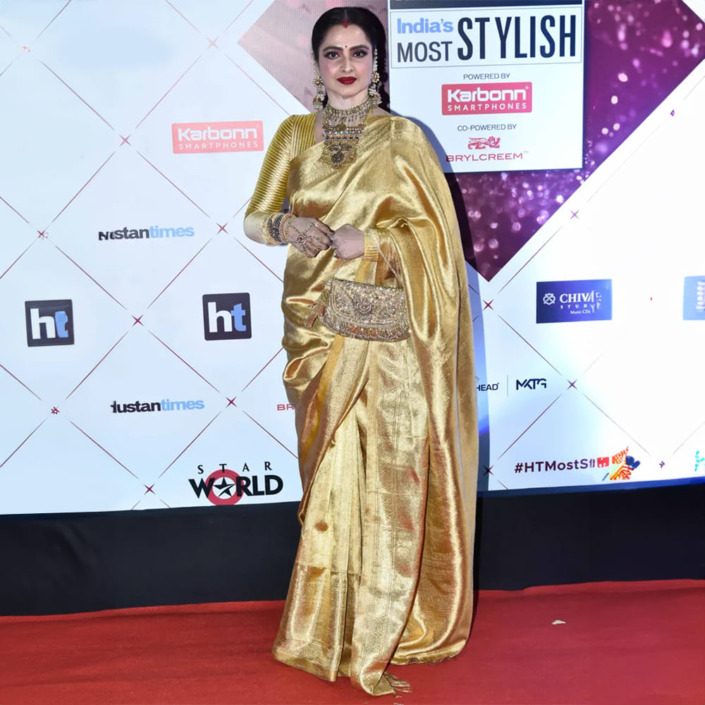 Bollywood style icon Rekha never fails to make a statement, she dazzles in gold Kanchipuram tissue saree, paying tribute to her roots and timeless elegance. Known for her impeccable choice, the actress Rekha gracefully chooses rich Kanchipuram sarees even for grand red carpet events, combining culture with glamour. The gold Kanchipuram tissue saree glows with the shimmering intricate zari artistry, which complements her signature style and reflects her admiration to south Indian heritage.