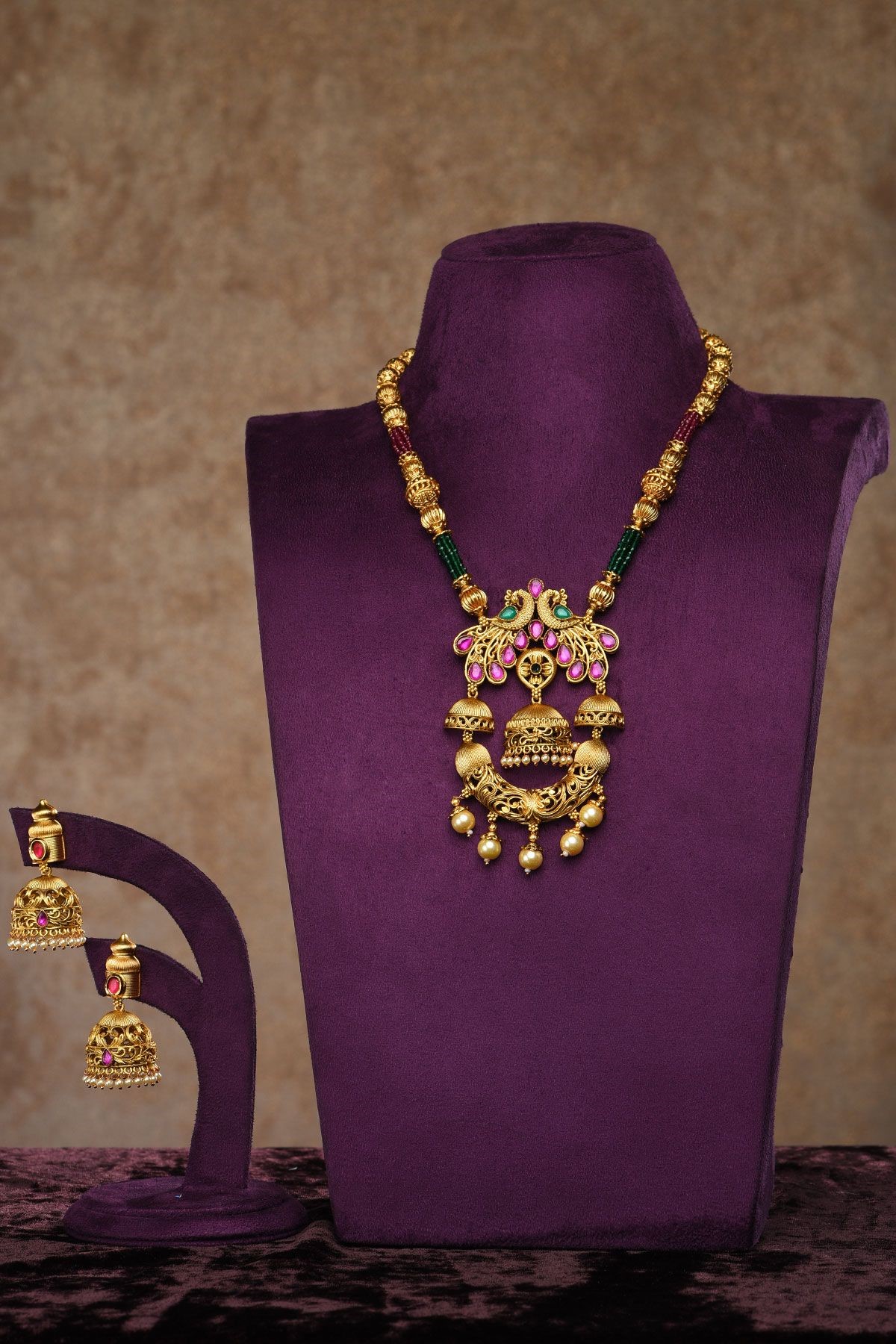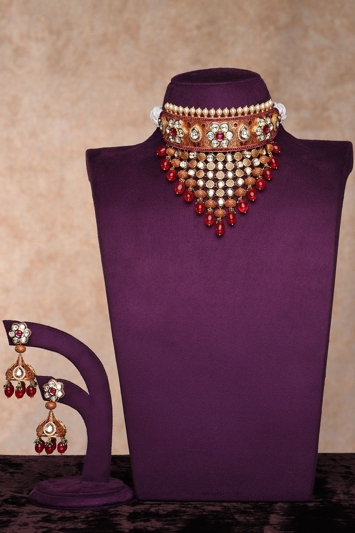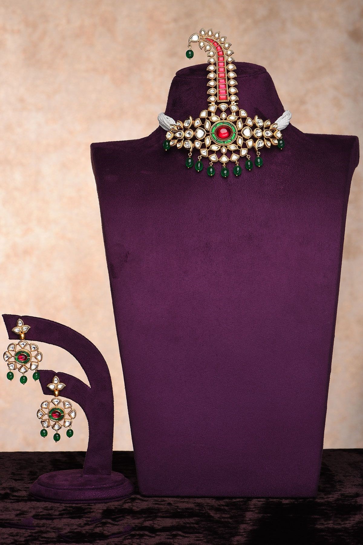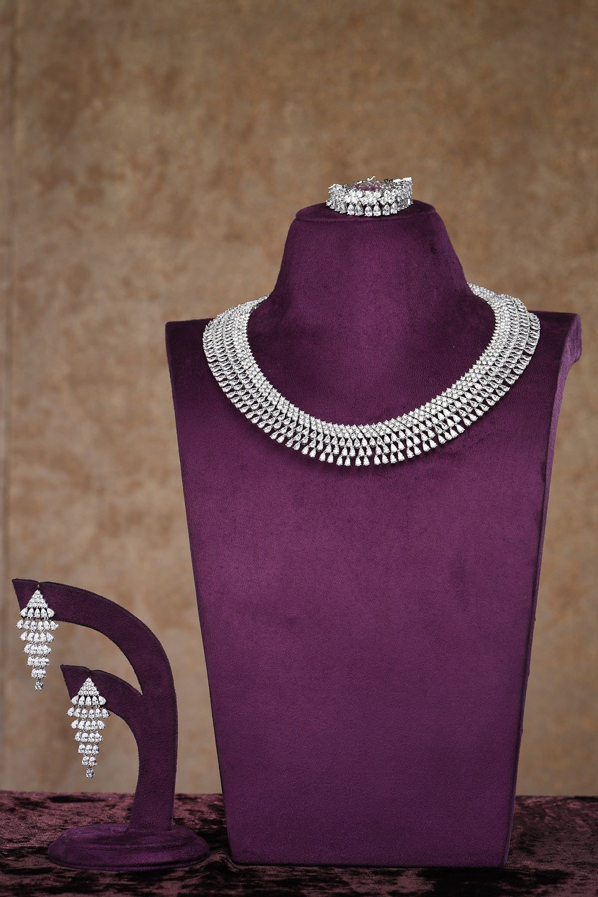 The tradition is still alive because of our religious believes that upholds the values which are deeply grounded. Silk saree is known to endorse the ethics hence draped to attain any rituals. What else can drive you more devotional and the celebration ambiance than this Kanchipuram silk saree? Presenting you the matching imitation diamond collar necklace set to accentuate your charm.