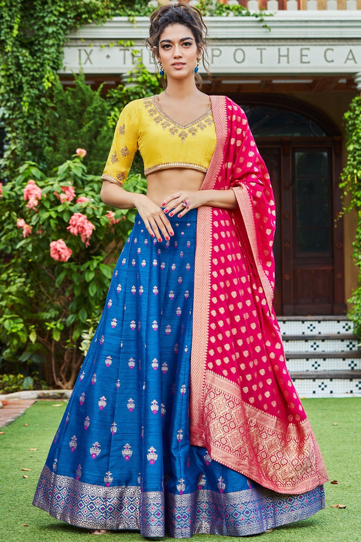 Silk, the fabrication symbolizes peace and purity. It is always appropriate for any festival and ceremonies. The recommended bridesmaid’s lehenga invokes the enchanting visage for this festival. It is tailored with vibrant colored silk material. Coordinate with the temple jewellery and look graceful.