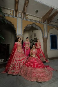 Reception is a post wedding celebration where it’s a bride wishes to shine in glamour. Reception lehengas embody sophistication with modern elegance. The lehenga carries celebration with each detail embracing the luxurious fabrics, sparkling sequins, gleaming zardosi and rich crystal detailing. The color palette of the reception can be chosen form dreamy pastels to regal maroons or rich emerald greens to elegant blues which transforms the bride’s look on her special day.