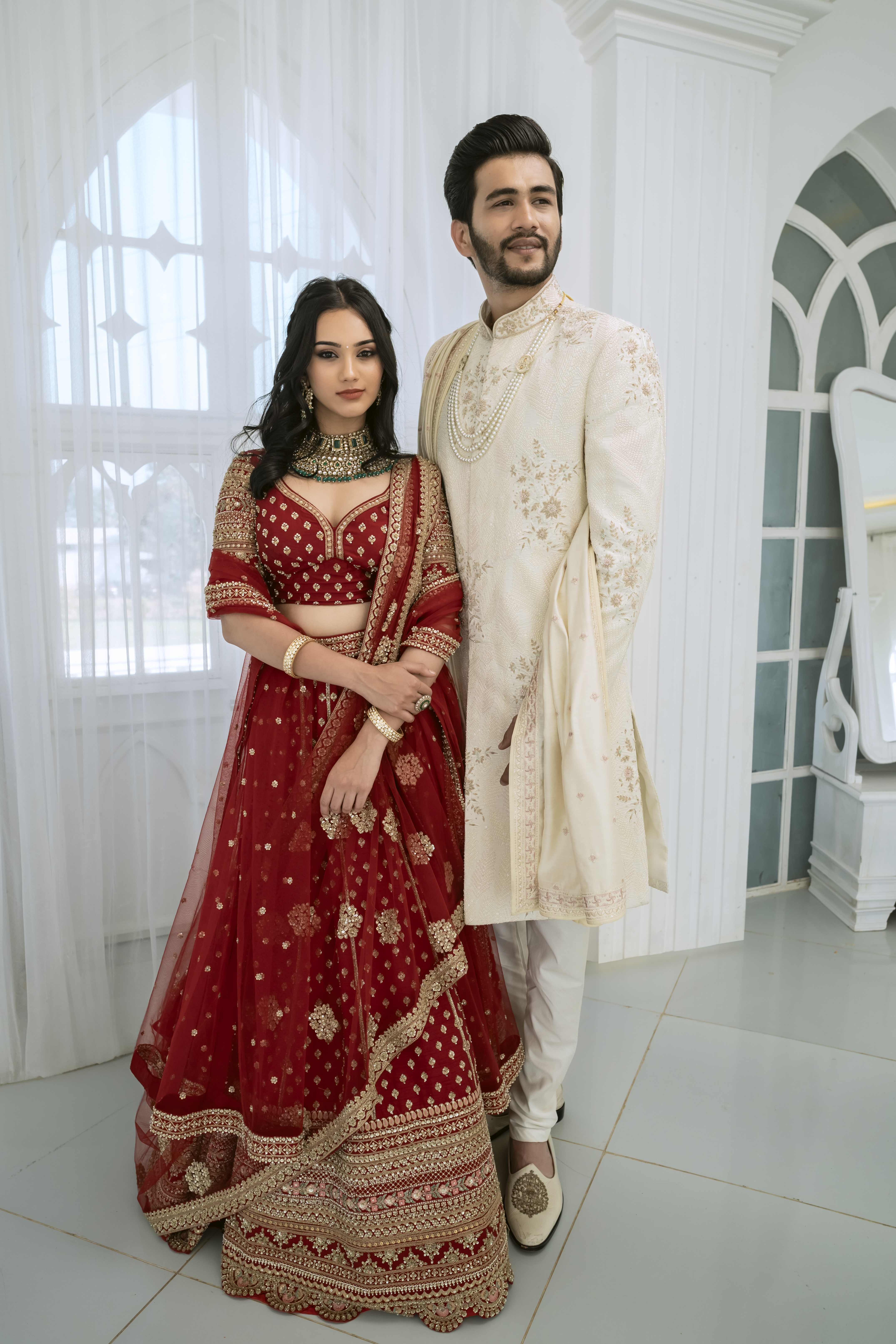 Adorn yourself in the captivating combination of red and cream, where intricate threads weave a beautiful wedding dream. With every stitch, a story of love and beauty unfolds in bold vibrant hues. This lehenga and sherwani set pure and grand is crafted to make your love story stand out. Elegantly embroidered it’s the perfect sight for your special day, ensuring you shine bright.