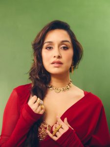 Embracing the “method dressing” trend for Stree 2, Shraddha stunned in a regal sindoori red saree by House of Masaba. The heavy crepe drape featured oversized gold motifs and a long trail. Styled with a matching deep-neck, long-sleeved blouse and a kundan choker, this look is a masterclass in traditional sophistication.