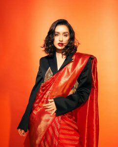 Shraddha broke the internet with this bold Indo-Western fusion look, pairing a classic red Banarasi saree with a black full-sleeve short jacket. The gold embellishments on the jacket perfectly complemented the saree’s brocade work, creating a fierce, boss-lady aesthetic that is perfect for winter weddings.