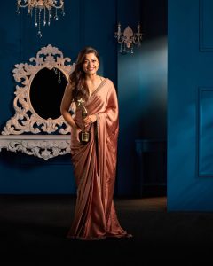 She was one of the biggest winners of the night. The leading lady of Tollywood sashayed the night at the 13th SIIMA Award held in Dubai. She was posing in an elegant look in a Tarun Tahiliani saree. The champagne-colored satin saree looked striking and was paired with a halter-neck embellished blouse. The intricate details on the blouse were a complete showstopper. She won the best actress award for Pushpa 2 and was ruling the hearts with her talent and fashion sense. The sequins added a touch of glamour to her overall look. Her confidence and smile enhanced her natural beauty. It won’t be an exaggeration to say that she was the queen of the event.