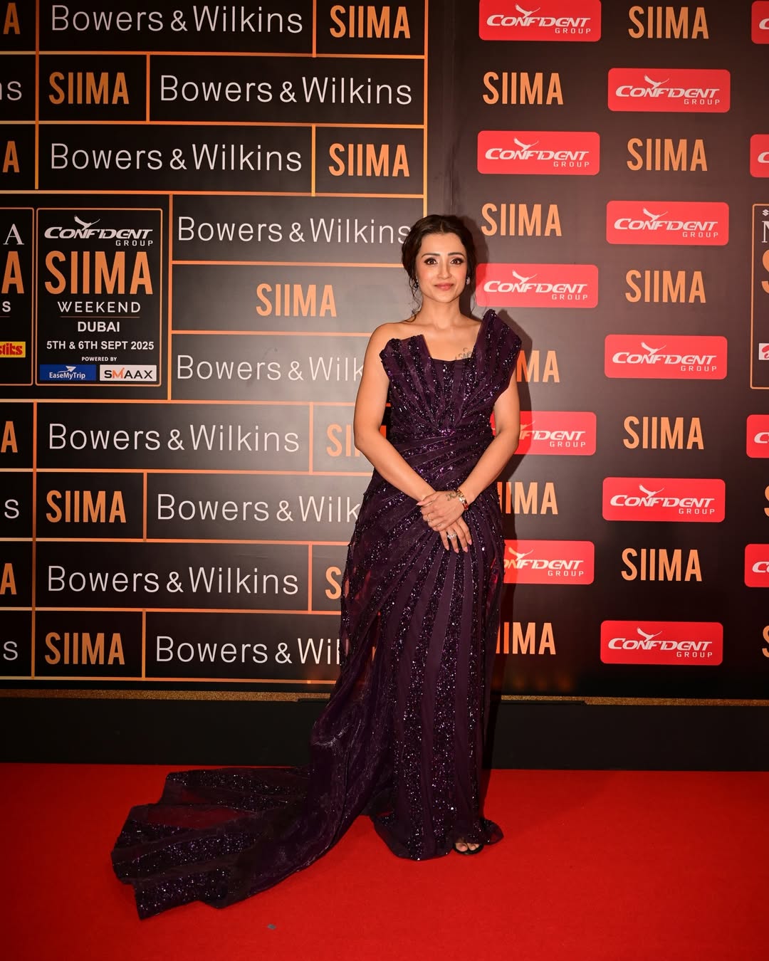 Trisha Krishnan is a special award recipient at the South Indian Cinema Award Show. She was honored for her ‘incredible work in South Indian Cinemas’. Fans cheered her the loudest and couldn’t keep calm for her performance as well as fashion spree. She wore a tulle gown reportedly designed by Amit GT, which proved her effortless glamor on the starry night. The one-shoulder purple-themed sequin gown showcased her impeccable fashion sense. If you are looking for the season’s most preferred trend for weddings, receptions, and cocktails, you can surely take notes.