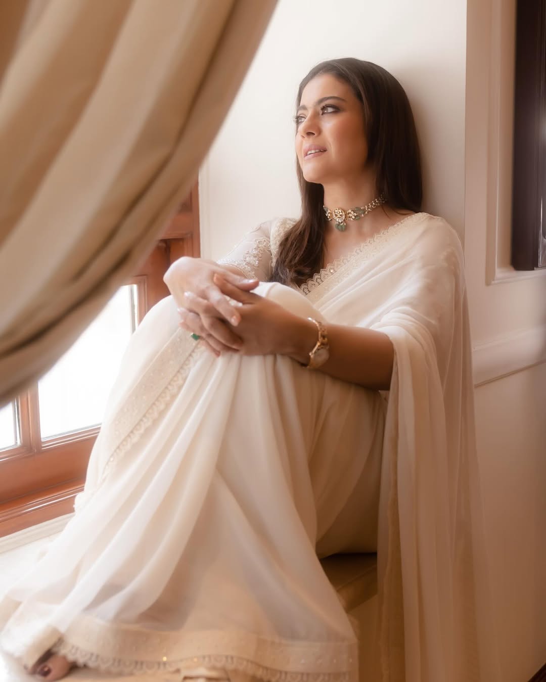 Kajol vouches for elegant and tasteful sarees that make her charming and dreamier. Just look how she enjoys the romantic and traditional appeal in a lightweight, semi-sheer, feminine saree. The peachy saree looks elegant, subtle, and timeless. The plain saree is an advantage for experimenting with accessories and jewelry. However, you can experiment with border designs, light embellishments, and prints as per the occasion.   You can also flaunt a chiffon saree in pastel hues at casual day brunches, day events, and evening occasions. Strappy blouses, designer blouses, or contrast blouse designs can further elevate the look of the saree.