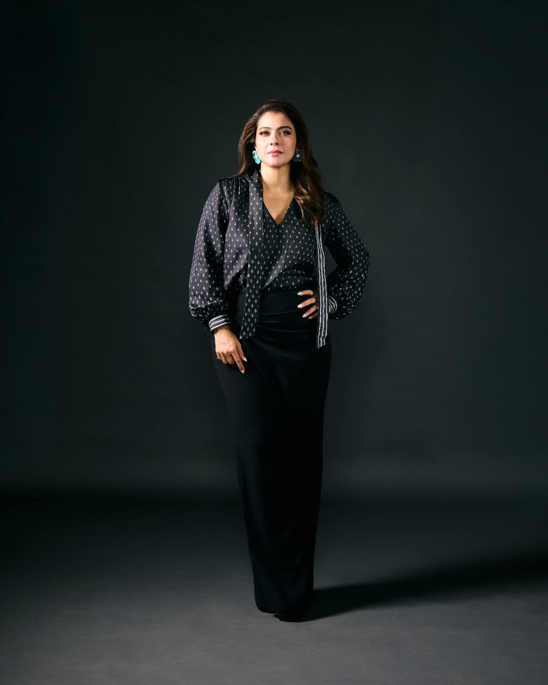 Her confidence and style are noticeable in every kind of outfit she wears. From a feminine salwar suit to sarees, power suits or top and skirt, she ensures a fearless approach to fashion. She blends edginess with elegance in this black printed top and skirt. You can flaunt a true boss lady vibe like Kajol in casual, ethnic, and formal wear. You can make the overall look dramatic by opting for a crop top and skirt or a blazer and skirt. An embroidered jacket and a trendy skirt below can showcase your impeccable style. Feel confident about your ability to pull off the bold and trendy look.