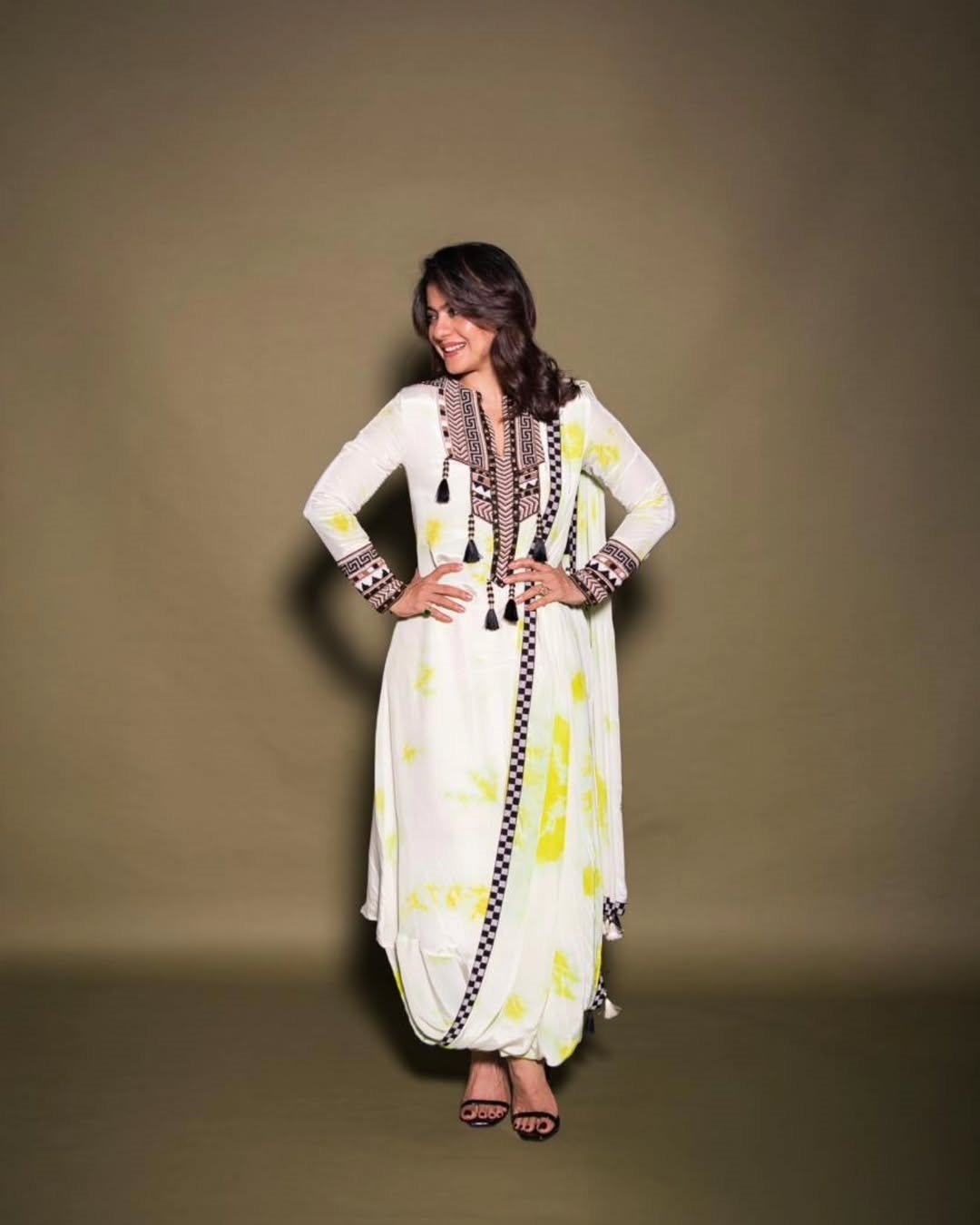 Kajol makes us all proud with her divine and demure ethnic wear. It’s a complete style evolution for the lady in a cream-colored tie-dye salwar kameez featuring a unique dupatta or a drape on one shoulder. True, her closet is as diverse as her acting skills. Her latest ethnic salwar suit look is breathtaking, making fans get crazy about her style. She has smartly added a dramatic flair to an ethnic salwar kameez. The cowl-like appearance at the hem of the designer suit is all about Kajol’s signature style. So, what are you waiting for? Get inspired by the star and keep trying out new styles.