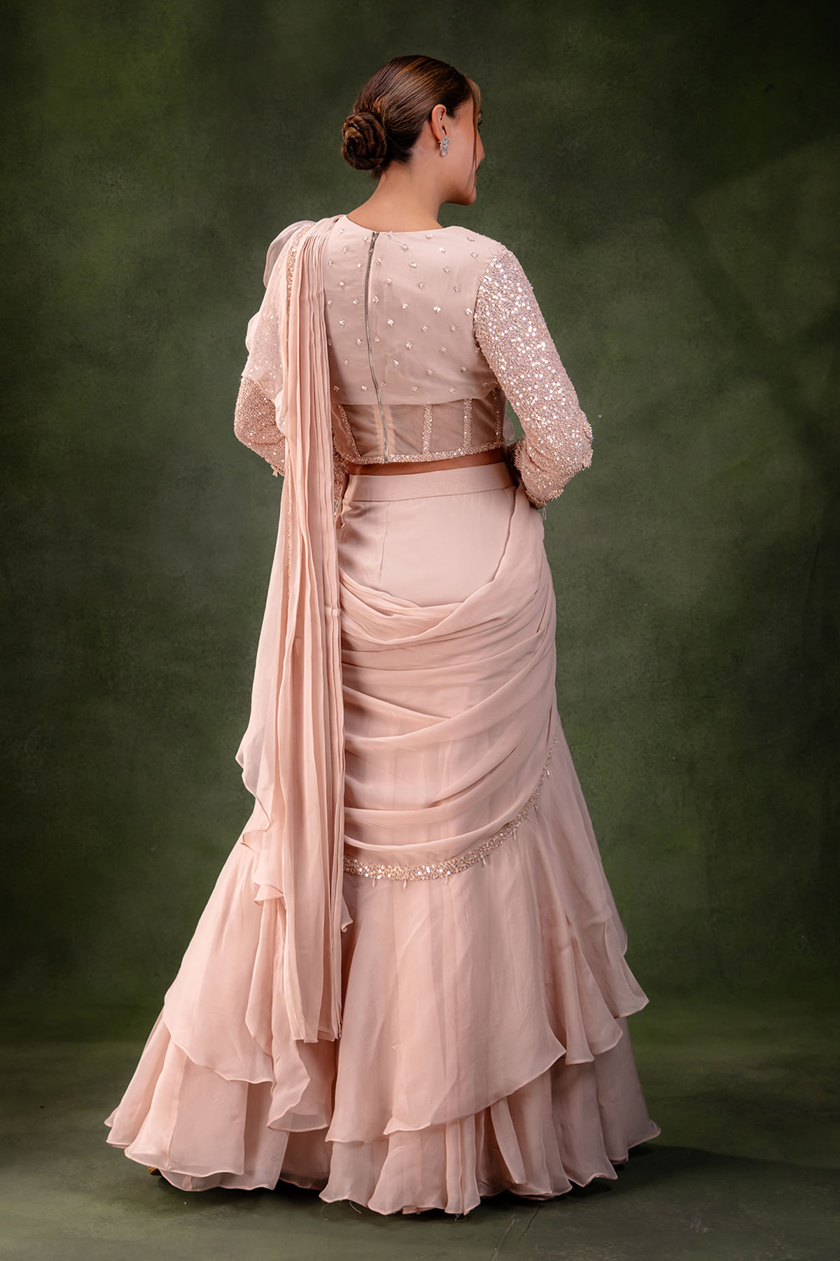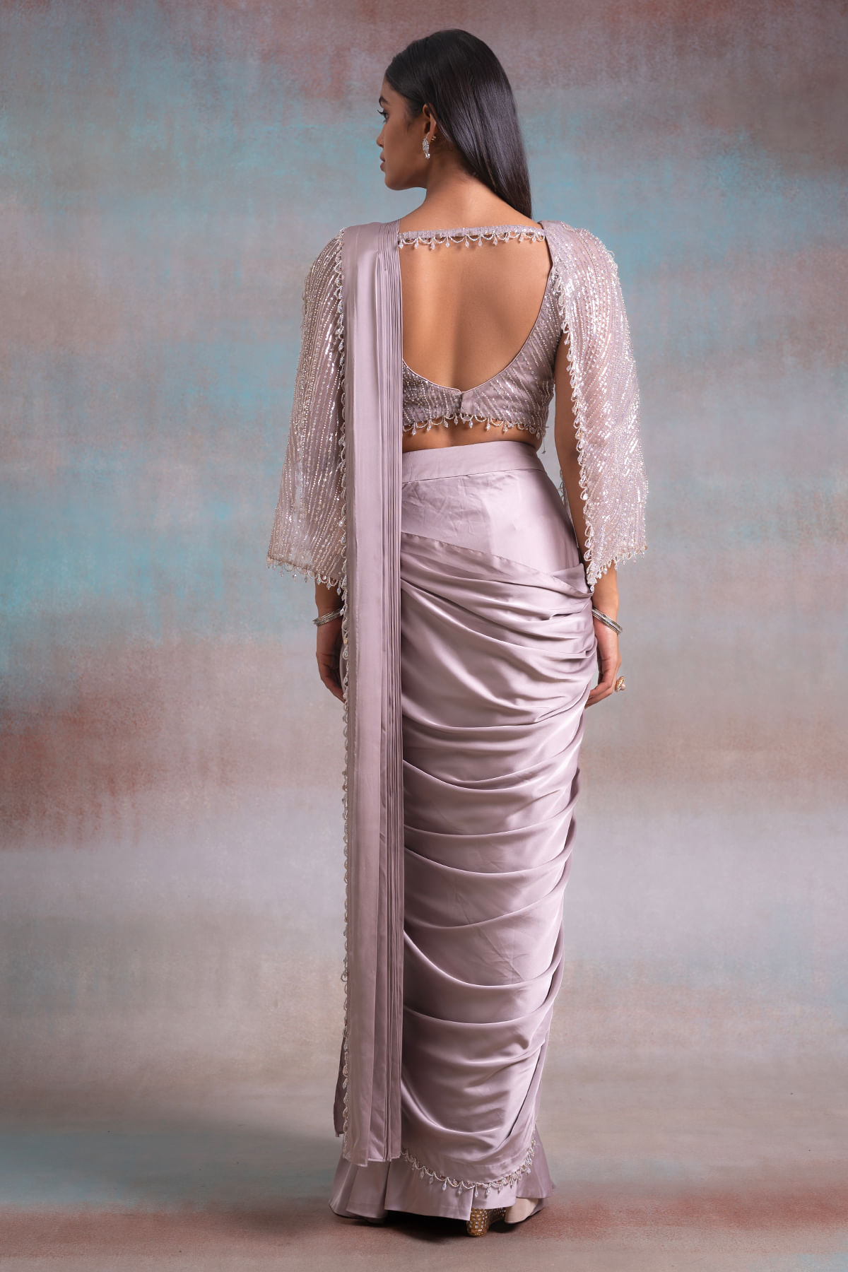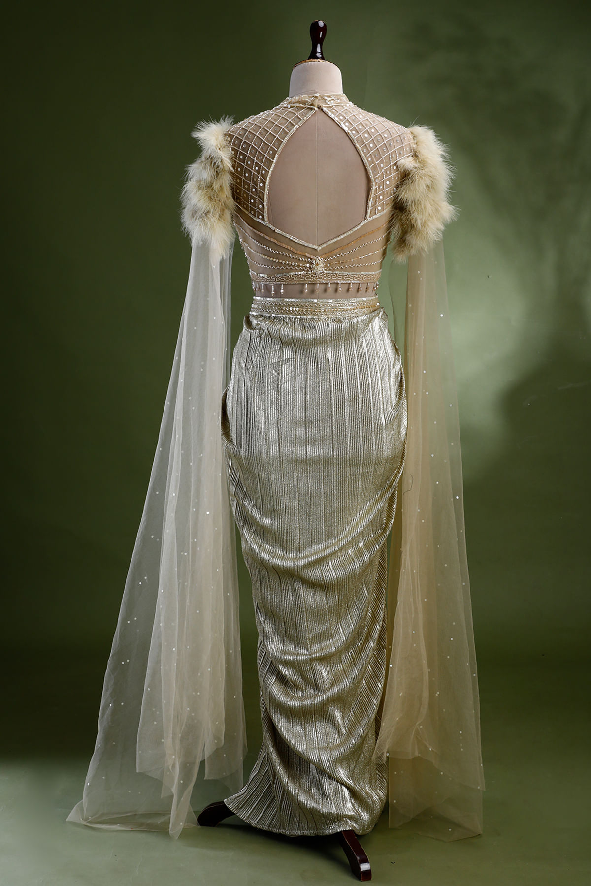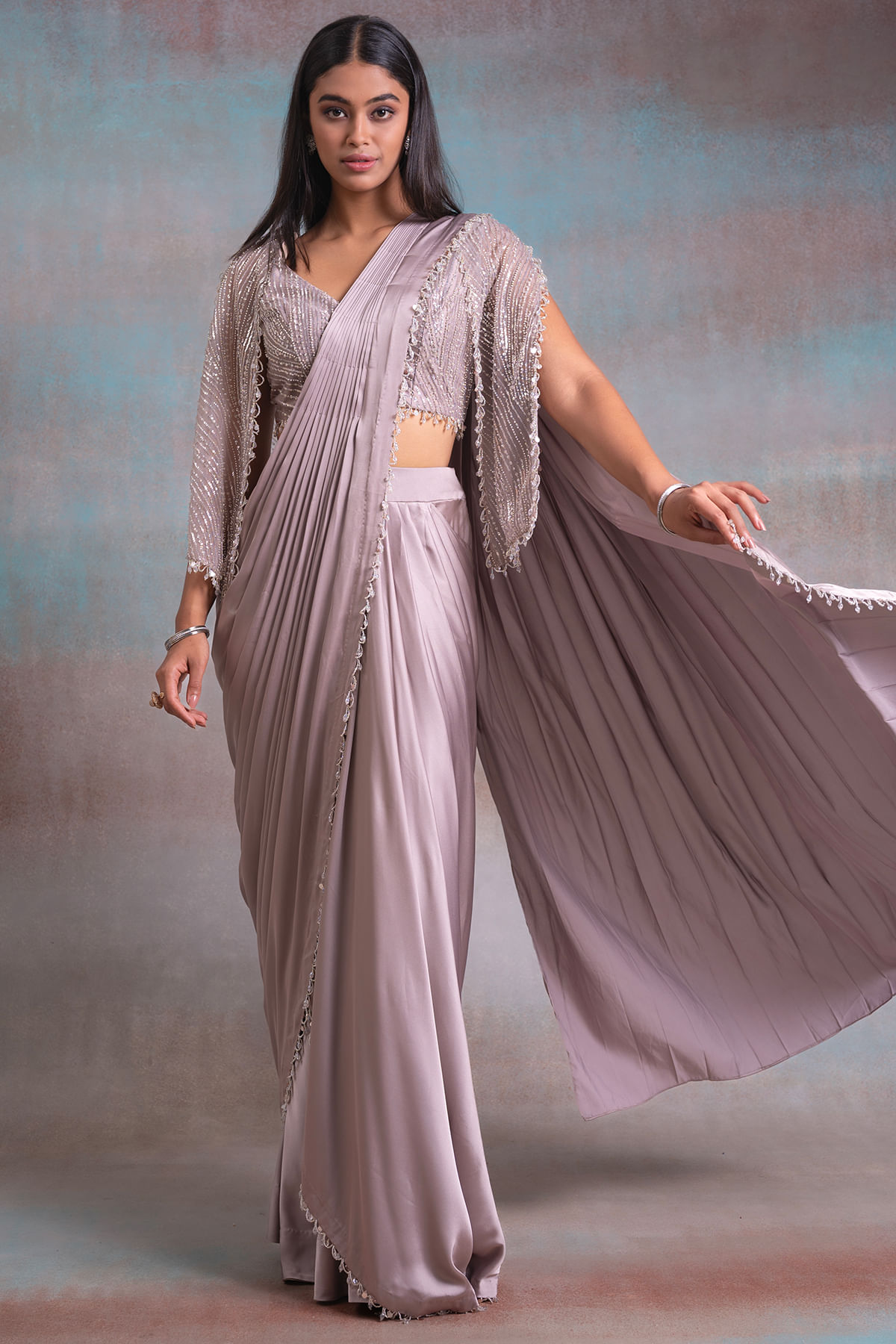 Pair a cape blouse with a saree, lehenga, dhoti skirt, or any drape, and you can achieve a fresh and tweaked look. It accentuates the look of a saree and creates a unique look. You can achieve a fairytale look effortlessly with saree blouse designs that feature a trailing cape. You can opt for blouses that have a short or a long cape.