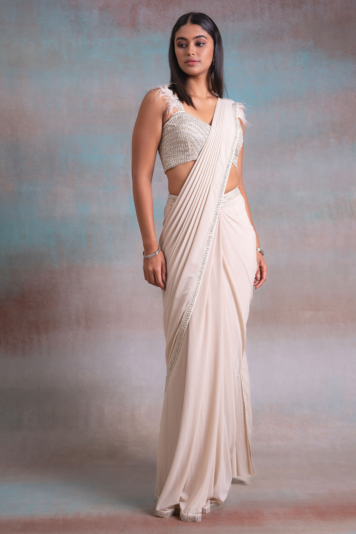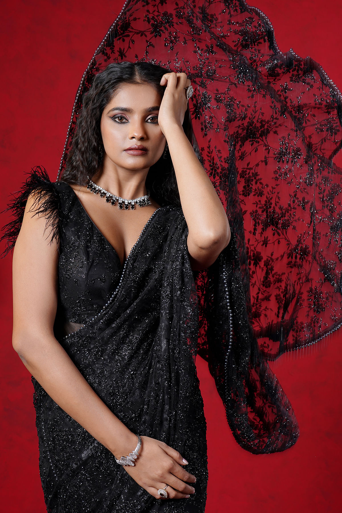 Feather is a light detail on the sleeves or the neck of the blouse that adds a unique dimension to the entire look of the saree. A velvet blouse with feathered sleeves looks pretty, preppy, and cute with ready-to-wear sarees, cocktail sarees, or gown sarees.