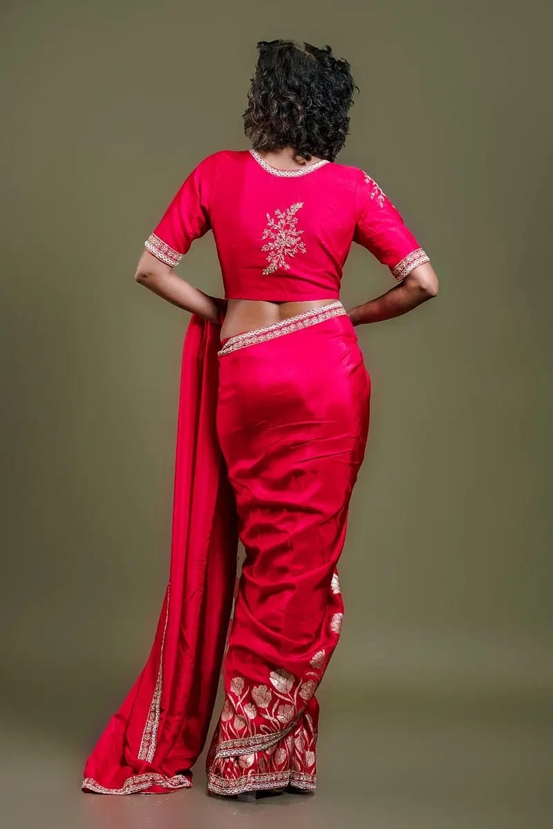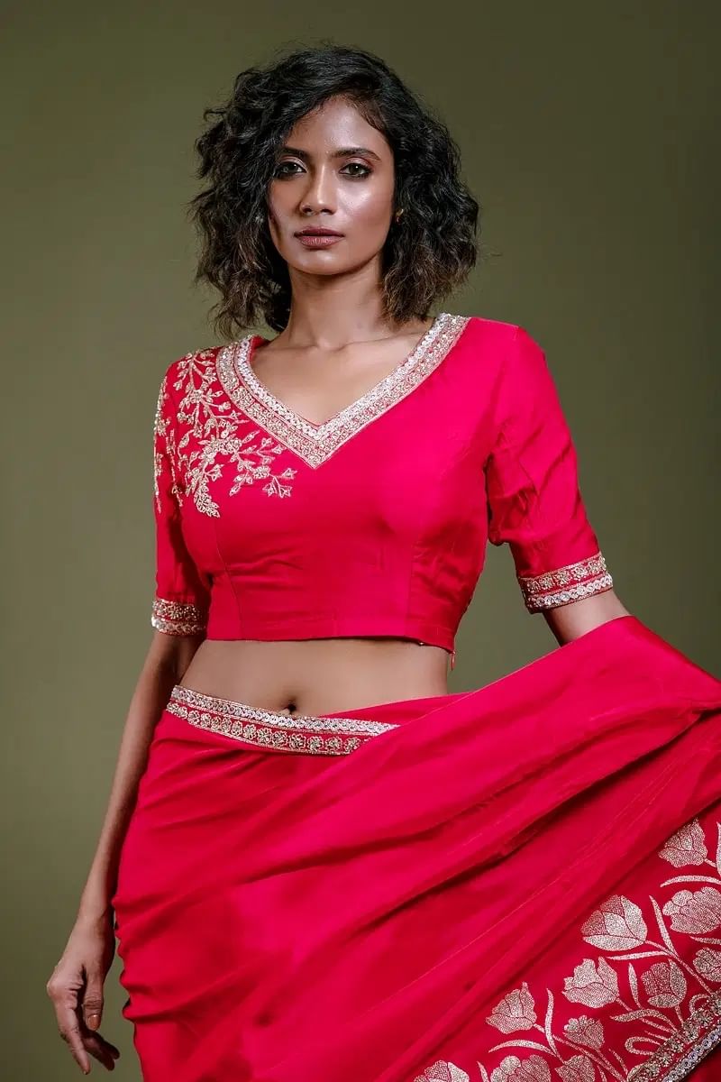 The plunging neckline is a new dimension to a saree blouse design. It adds freshness, feminism, and boldness to a diva’s saree for festivals and wedding celebrations. The fun and flirty designer blouse pushes the boundaries of fashion and is apt for wedding sarees, pre-stitched sarees, lehenga sarees, gown sarees, and skirts. The plunging neckline is high on glitz and glamor.