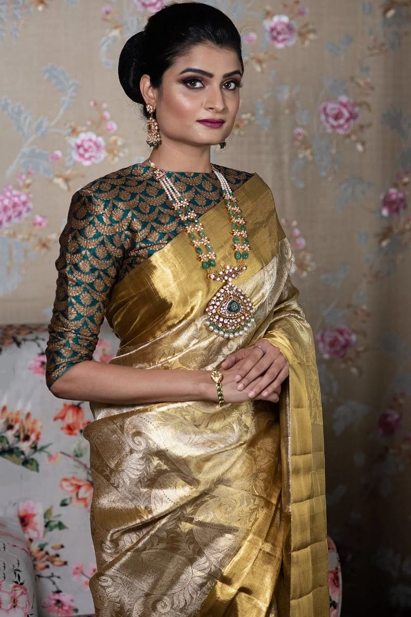 Popular designs are fine, but nothing can add a touch of elegance and sophistication like a full-sleeved blouse. It’s a versatile element that updates the look of a blouse for weddings and festive sarees. Full-sleeved blouse looks good with silk, banarasi, kanjivaram, and other traditional sarees.