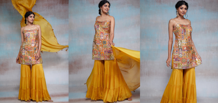 The salwar kameez is an immortal trend. Various cultures and eras in the past have impacted the design and style of salwar suits. These ethnic wear collections have undergone transformations and innovations with time. Women have been exploring the various facets of the three-piece attire to look ethnic, as well as fashionable. From super-traditional to trendy and fusion, there have been variations in salwar kameez suit designs in terms of fabric, color, embellishments, and patterns. Out of all the ethnic sets including straight suits, crop top suits, Anarkali, etc., sharara suits are one of the most popular styles that blend traditional as well as modern aesthetics.